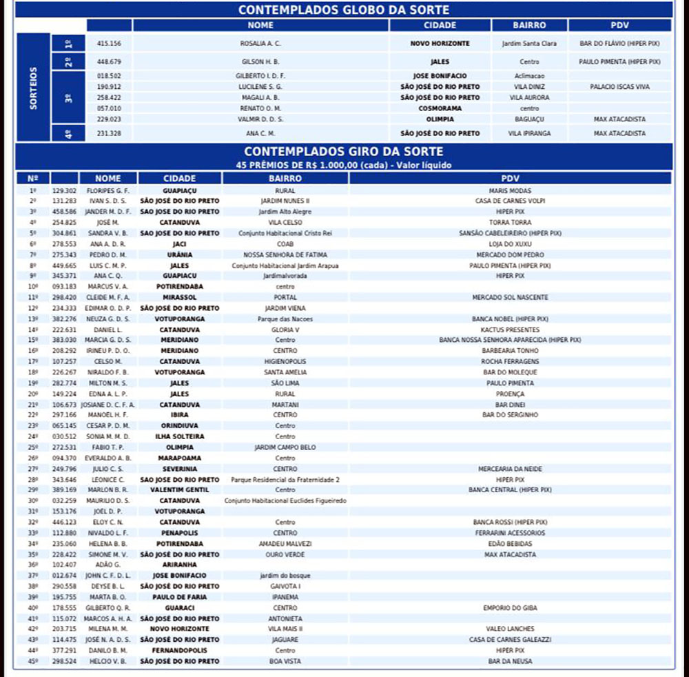 – 3º Sorteio: 5 ganhadores (José Bonifácio, 2 S J do Rio Preto, 1 Cosmorana e 1 Olímpia) – Prêmio: R$ 20 mil;