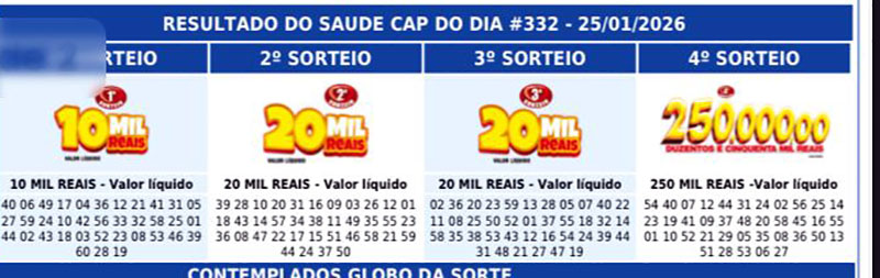 E é assim que o Título de Capitalização Saúde Cap vem fazendo pessoas com a alegria todas as manhãs de domingo, e para fechar o mês de janeiro/2026, foi a vez da Edição nº 332, que teve transmissção ao vivo pela TV Recorde de Rio Preto e pelo YouTube. Acompanhe os ganhadores: