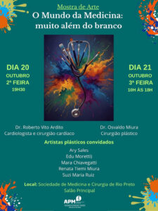 Em comemoração ao Mês do Médico, a Sociedade de Medicina e Cirurgia de Rio Preto realiza a exposição “O Mundo da Medicina: muito além do branco”, nesta segunda-feira (20/outubro), às 19h30, e na terça-feira (21/outubro), das 10h00 às 18h00, no salão principal do Clube dos Médicos. A exposição é aberta à população, com entrada gratuita.